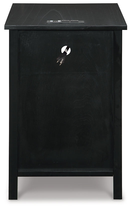 Add big character to a small space with this chairside end table. With its compact size and strong silhouette, it can go anywhere and blend easily into the decor. Less is so much more with the Shaker-inspired design and black wood tone finish. Loaded with form and function, this end table displays accent pieces and stores essentials securely while keeping devices powered up.